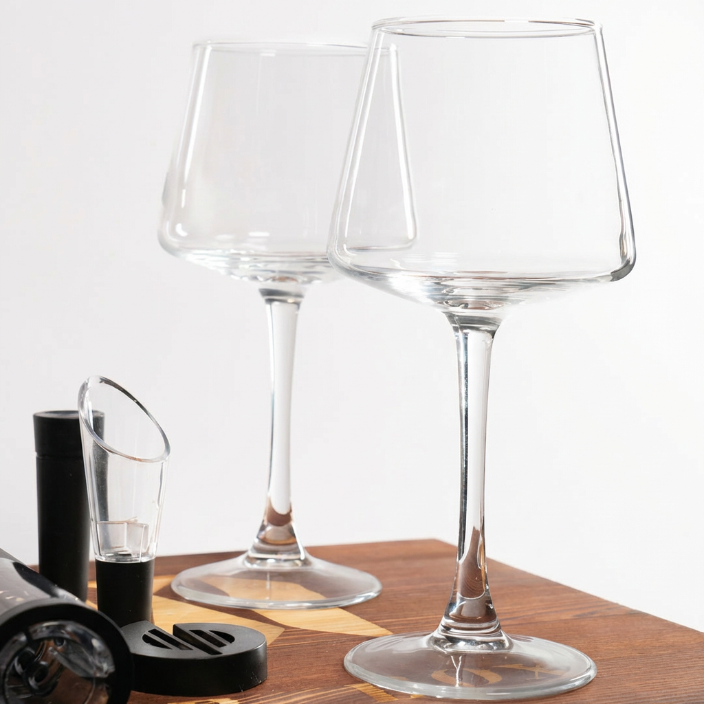 • Două pahare — forma este potrivită pentru vinurile roșii care au nevoie să „respire”.