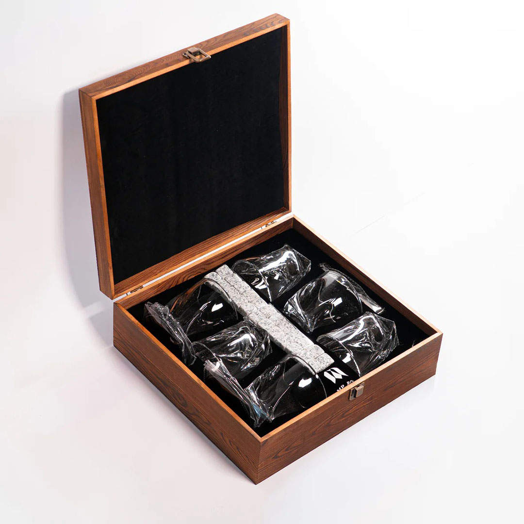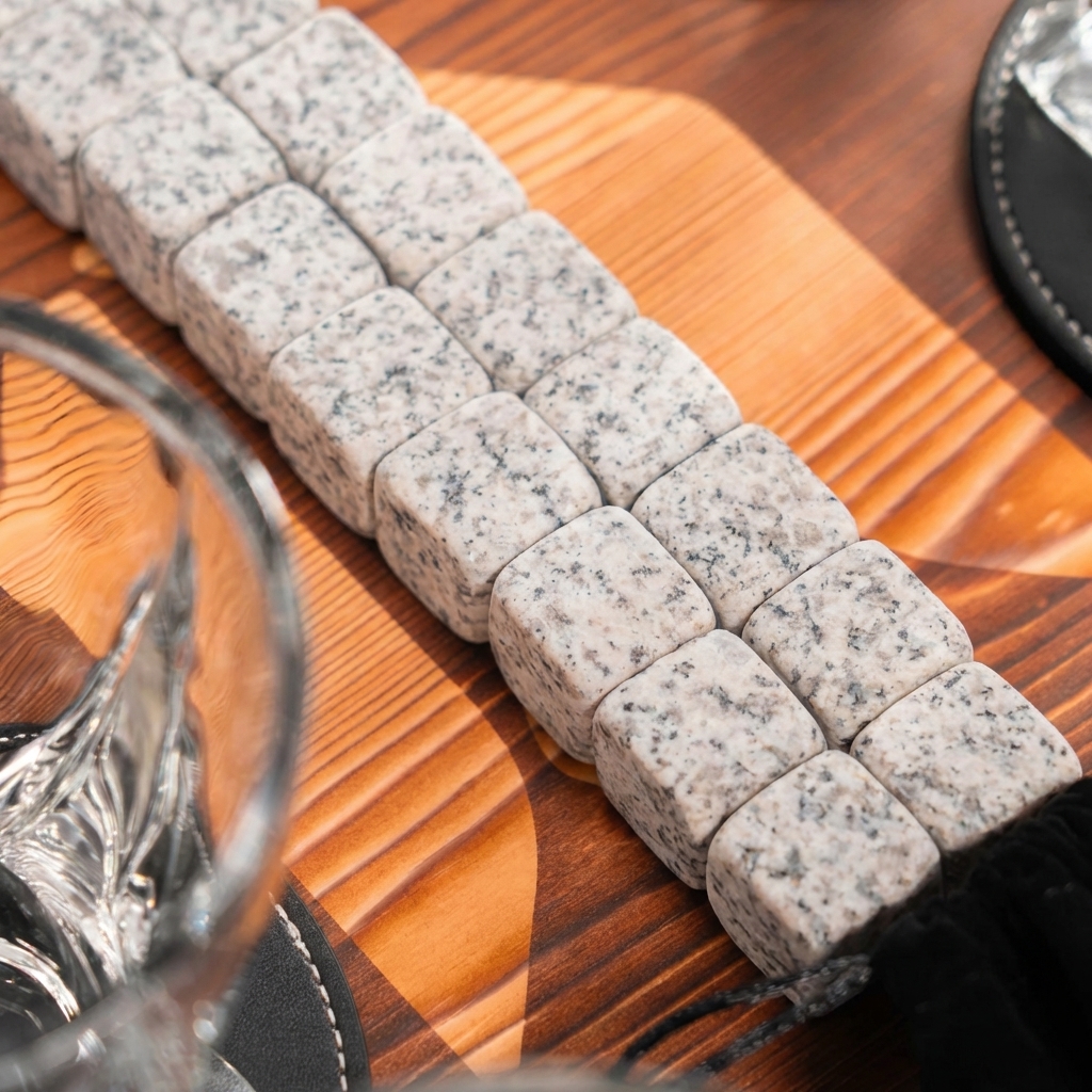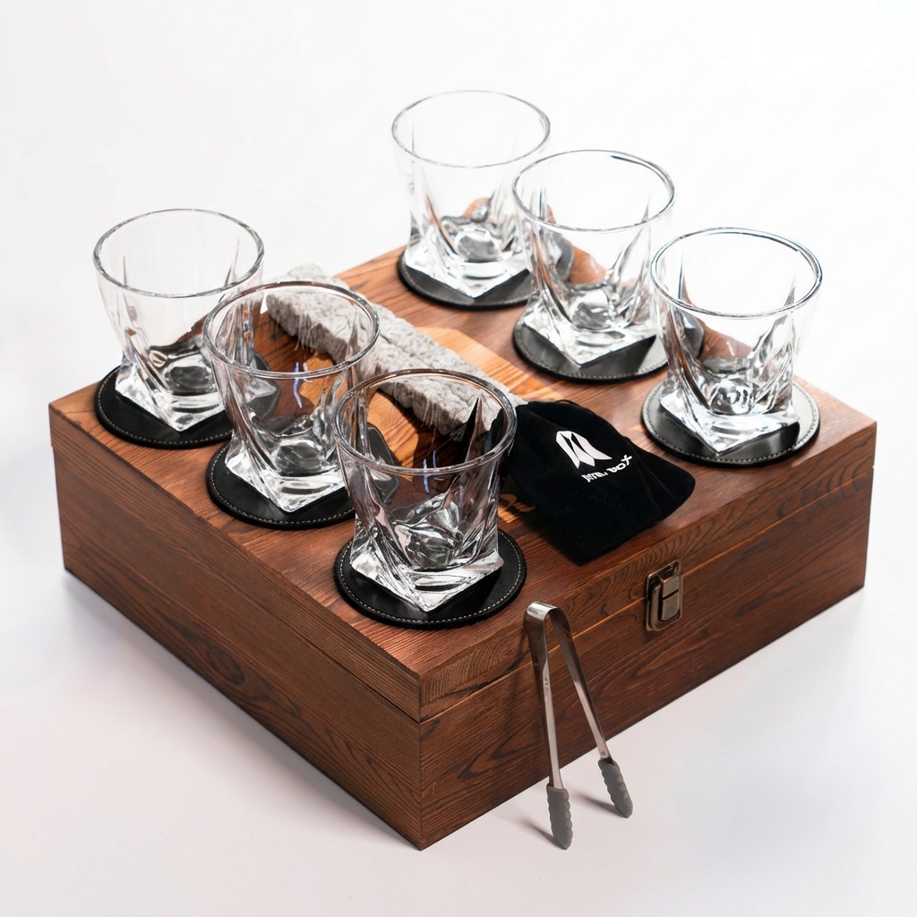Inclus: • 6 pahare – suficiente pentru un grup. • 6 suporturi pentru pahare – pentru fiecare oaspete. • Clește – ușor de utilizat. • 24de pietre de răcire sunt suficiente. • Geantă de depozitare – comandați după seară.
