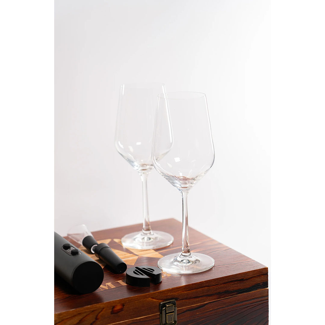 • Două pahare — forma este potrivită pentru vinurile roșii care au nevoie să „respire”.